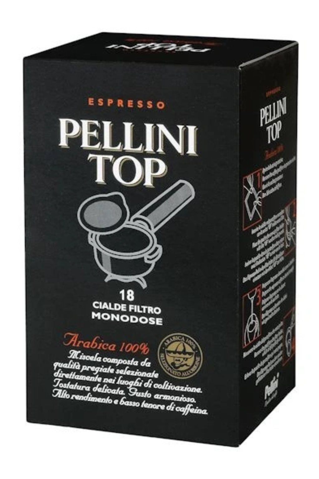 Pody velikosti 44mm plněné s jednou porcí směsi Pellini TOP 100% Arabica. Směs Pellini TOP 100% Arabica, jak i název značí, je vrcholnou směsí pražírny Pellini. Kávu Pellini Top tvoří devět prvotřídních Grand-Cru Arabic. Směs obsahuje 100% zrn Arabica. Příprava pomocí jemného pražení zajišťuje harmonickou a lahodnou chuť i vůni. Vyznačuje se nízkým obsahem kofeinu do 1,7% a řadí se mezi nejkvalitnější italské kávy.